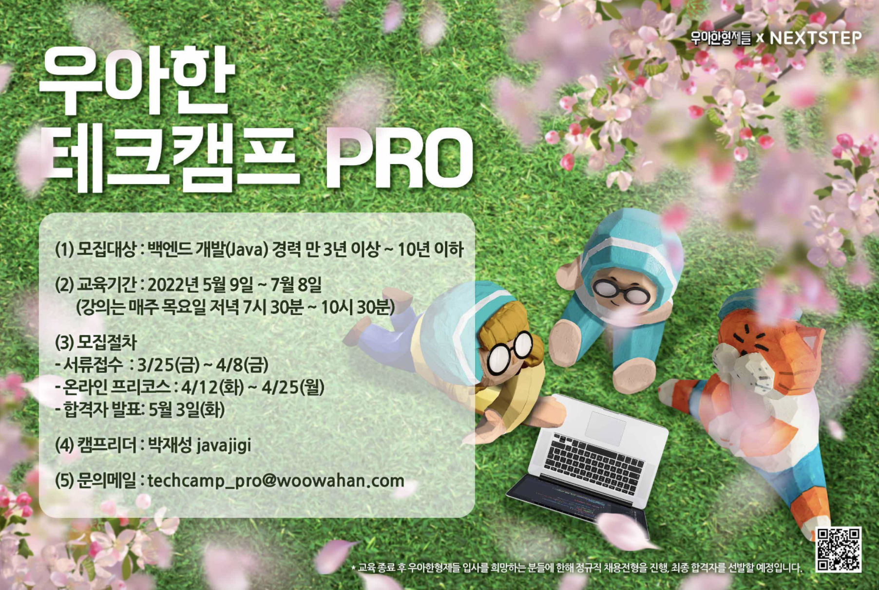 우아한테크캠프Pro의 존재는 알고 있었지만 본격적으로 관심을 갖게 된 계기는 우아한Tech 유튜브 채널에서 설명회를 진행할 때 라이브 방송을 챙겨 보았고 나에게 필요한 교육 과정이라는 생각을 하게 되었습니다.