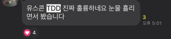 특히 제가 하는 발표이니 제가 TDD를 하면서 겪었던 점들을 발표에 녹여내는 게 중요할 것 같다는 의견을 주셨는데 이 부분이 발표를 준비하는 데에 있어서 주요했던 것 같습니다.